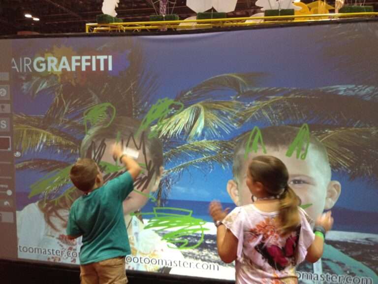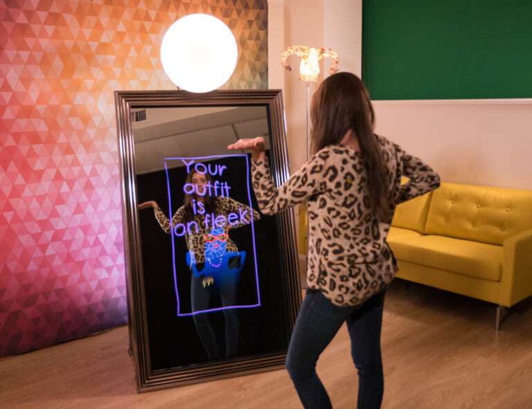 The Mirror Me Booth takes photo booth fun to a whole new level. As participants walk up to the mirror, colorful animations and voice guidance invite them to engage in a magical, interactive “selfie” experience presenting a photo keepsake. The Mirror Me Booth is a unique photo-generating product offering the latest technology in interactive picture taking.